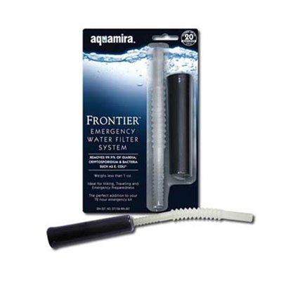 FRONTIER Emergency Water Filter System The ideal "just in case" filter straw for emergency use when traveling, hiking and fishing. Ideal as a backup filter for multi-day backpacking trips. The Frontier Filter can be used to drink from any bottle or cup, or directly from water sources. Removes contaminates down to 2 microns in size including wide spread pathogens such as giardia, cryptosporidium and large bacteria. Frontier's ultra lightweight and compact package size fits in the smallest day pack, waist pack or pocket. Filters up to 20 gallons of water! The Frontier Emergency Water Filter System is ideal for hiking, travel, and emergency preparedness. It is the perfect addition to your 72 hour emergency kit. One unit will filter up to 20 gallons (75L) of water. Tests indicate that the Frontier Filter will remove 99.9% of Cryptosporidium and Giardia. The Frontier Emergency Water Filter System is also easy to operate, just attach and expand the straw, submerge the filter end into the water source, and drink through the straw. Ultra light and compact, the Aquamira Frontier Emergency Filter System weighs less than one ounce and easily slips into a day pack, shirt pocket or travel luggage and is always ready when you need it. The Frontier Filter is the ideal alternative to heavy, bulky and expensive pump filtration units when space and weight are primary factors. Activated carbon helps reduce waterborne chemicals and improves water taste. Use the Frontier Emergency Water Filter System to drink from any bottle, cup or directly from water sources. To remove viruses or bacteria smaller than 3 microns in conjunction with Aquamira Water Treatment Drops or Aqumira Water Purifier Tablets before filtering.* *Sold separately See all Water Filter Straw, Frontier Emergency Water Filter System for Emergency Disaster Preparedness, Survival Kits, Survival Packs, Survival Gear, Camping,OverviewRelateItems